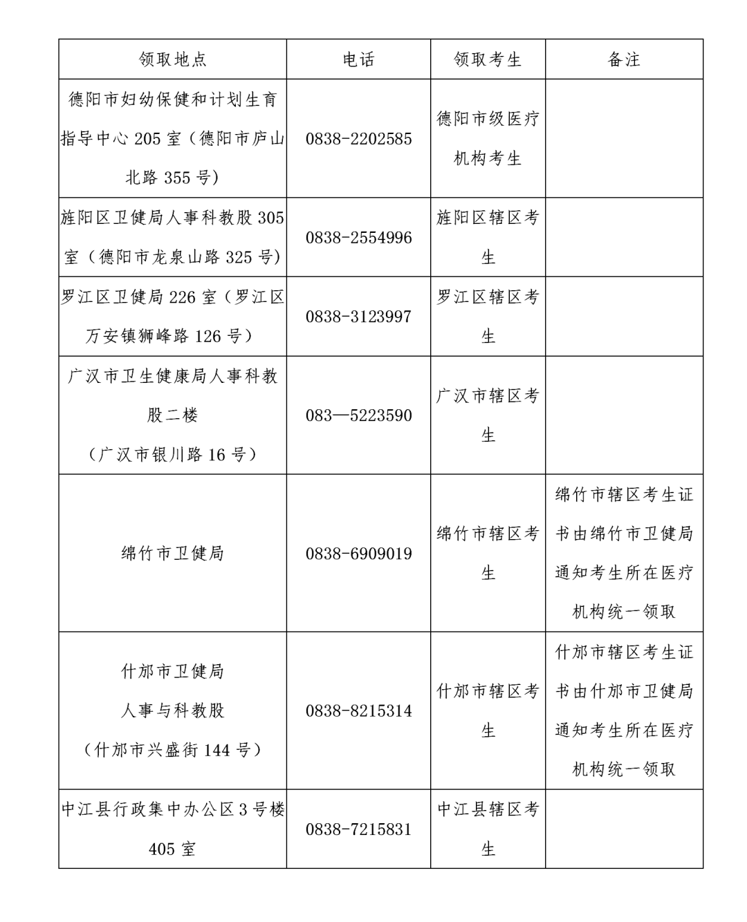 请德阳市人民医院、德阳市第二人民医院、成都中医药大学附属医院德阳医院、德阳市第六人民医院、德阳第五医院、德阳市口腔医院、德阳市精神卫生中心、德阳肿瘤医院、德阳眼科医院、德阳市疾病预防控制中心等10家医疗机构选派本单位职工持介绍信到德阳市妇幼保健和计划生育指导中心统一领取证书,以上10家医疗卫生机构的考生在本单位领取证书。