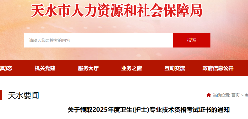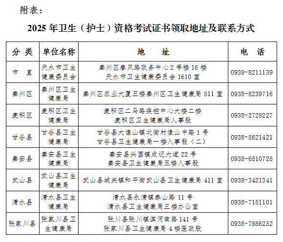 天水市2025年度卫生(护士)专业技术资格证书已下发各单位、县区,请成绩合格人员及时到报考资格确认地点领取证书。具体联系方式见附表。