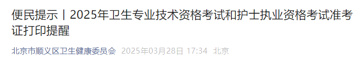 【北京顺义】2025年卫生专业技术资格考试和护士执业资格考试准考证打印提醒