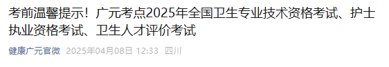 广元考点2025年全国卫生专业技术资格考试、护士执业资格考试、卫生人才评价考试将于4月12日、13日、19日、20日、26日在广元市利州中等专业学校及广元市会计财政学会考场举行,具体考试时间请以准考证为准。为确保顺利参加考试,现将考试有关事项做如下温馨提示: