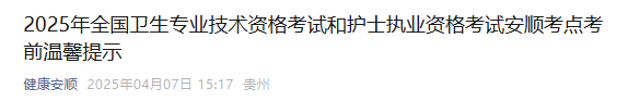 卫生专业技术资格考试请考生于2025年4月2日至4月20日通过登录报名系统打印准考证;护士执业资格考试请考生于2025年4月16至26日(安顺考点的考试时间为4月26日)通过登录报名系统打印准考证。为防丢失,考生可多打印几份准考证以作备用。携带《准考证》和有效《居民身份证》原件参加考试。请认真阅读准考证上每项信息,特别是考场名称、地址、试室号、座位号等。如有疑问请及时与考试部门联系(0851-33236341)。