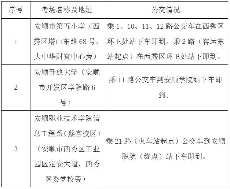 2025年全国卫生专业技术资格考试共设置3个考场,分别为安顺职业技术学院信息工程系(蔡官校区)、安顺开放大学、安顺市第五小学(纸笔考试);护士执业资格考试共设置1个考场,即安顺职业技术学院信息工程系(蔡官校区)。请考生仔细对照准考证上的考场名称,提前一天熟悉考场交通线路(特别提醒:我市正在进行排水防涝管网提质改造等工程,部分路段占道施工,可能影响交通出行),安排好食宿,尽量选择乘坐公共交通工具参加考试。各考场名称、考场详细地址及到达公交线路如下: