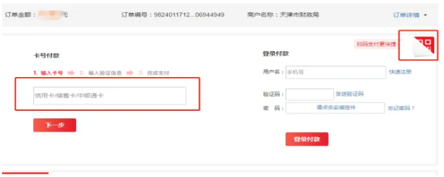 4.1跳转到银联缴费页面后可以选择左边输入银行卡号缴费,也可以点击右上角后用“银行卡云闪付”扫描缴费。