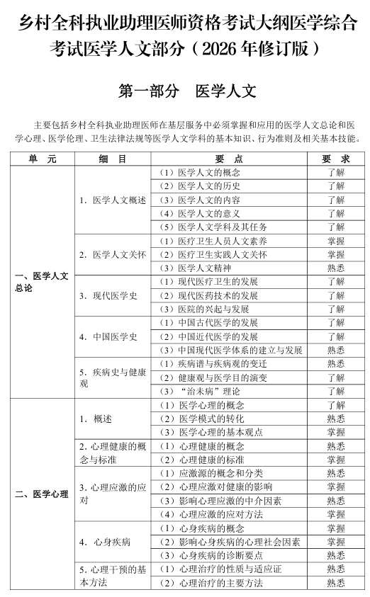 2026年乡村全科助理医师《医学人文》大纲修订版下载