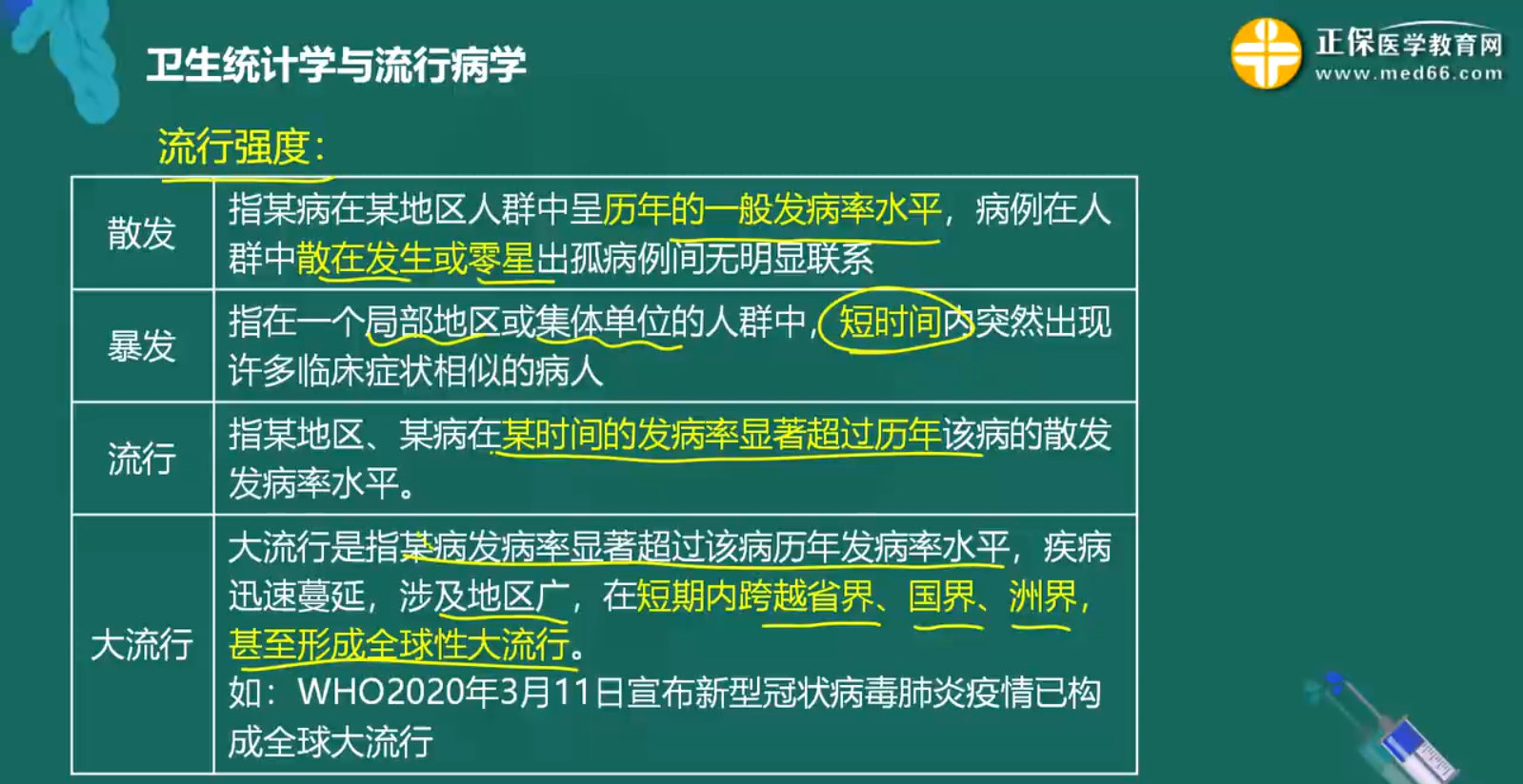 流行病学是研究疾病与健康状态在人群中的分布及其影响因素,借以制订和评价预防、控制和消灭疾病及促进健康的策略与措施的科学。需要重点掌握的是流行强度包含的几个概念的鉴别,还有三间分布的概念。