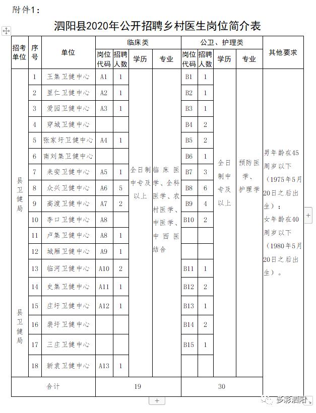 本次面向社会公开招聘乡村医生的岗位、计划招聘人数及相关要求等见《泗阳县2020年公开招聘乡村医生岗位简介表》(附件1),以下简称《岗位简介表》。