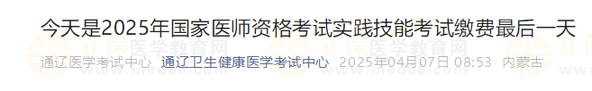 提醒:内蒙古通辽考点2025年医师资格考试实践技能考试缴费最后一天,未交费考生请尽快缴纳,医学教育网小编整理通知如下: