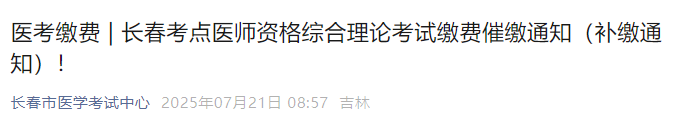 吉林长春2025年医师资格综合笔试未缴费考生注意:长春考点开放了补缴入口,仅开放两天,请抓紧时间完成缴费,否则不能参加2025年医师资格医学综合考试!