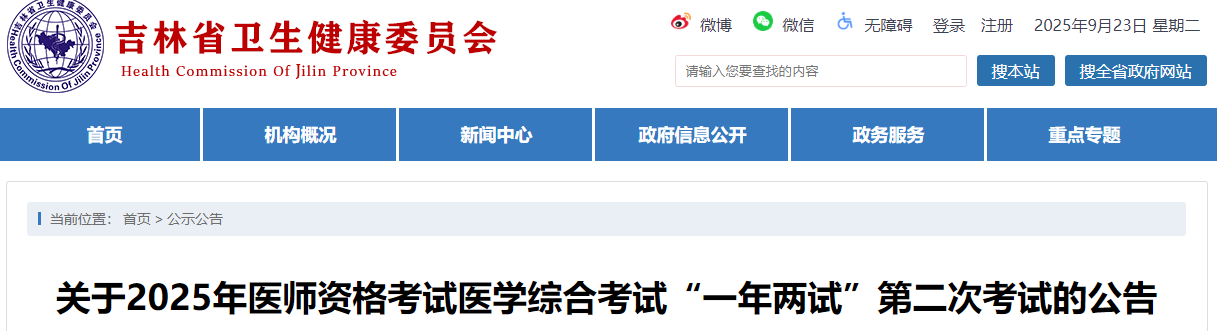 按照《国家卫生健康委医师资格考试委员会办公室关于2025年医师资格考试医学综合考试“一年两试”工作的通知》要求,现将吉林省2025年医师资格考试医学综合考试“一年两试”第二次考试有关事宜公告如下: