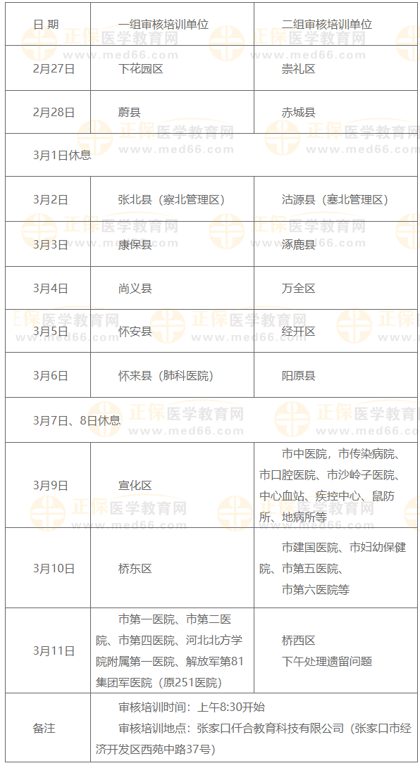 (二)各县(区)卫生健康局负责收取本辖区所有医疗机构考生的报名材料,将初审合格考生的报名材料原件收集、整理后,由各卫健局主管考试的负责人带队,带领本辖区考生按照下表时间到张家口仟合教育科技有限公司(张家口市经济开发区西苑中路37号)进行资格复审培训(复审培训时考生本人、报名纸质材料必须到场)。