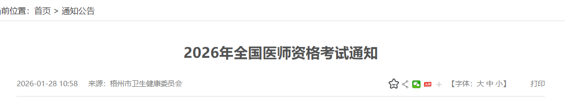 根据广西壮族自治区卫生健康委员会公告(2026年第3号)要求,现将本考点2026年全国医师资格考试有关事项通知如下: