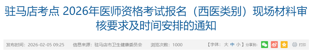 按照“国家卫生健康委员会医师资格考试委员会公告(2026年第1号)”及省卫健委 2026年国家医师资格考试现场审核有关要求,为合理安排现场审核工作,现结合我市实际,将驻马店考点2026年医师资格考试现场审核有关事宜通知如下: