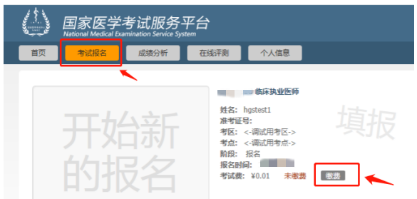 3.点击“考试报名”,然后点击“缴费”。
