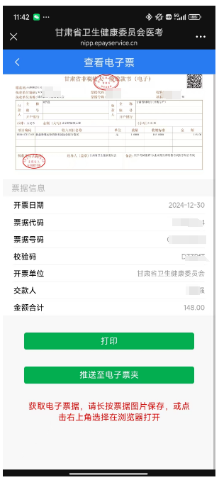 2.关注“甘肃省卫生健康委员会人才服务中心”公众号,选择发票打印,进行电子票据查询打印,如下图6、图7所示。