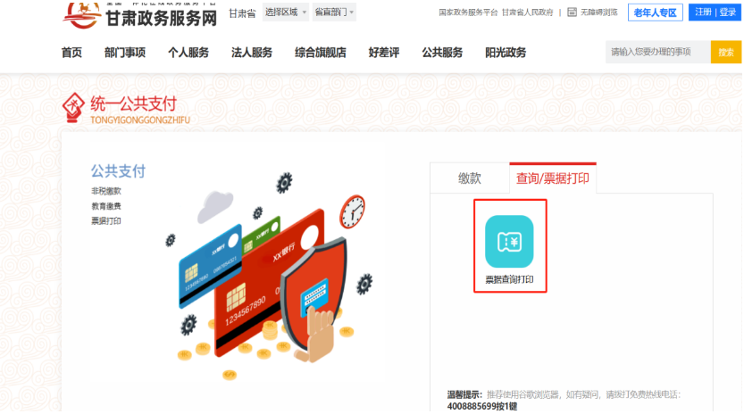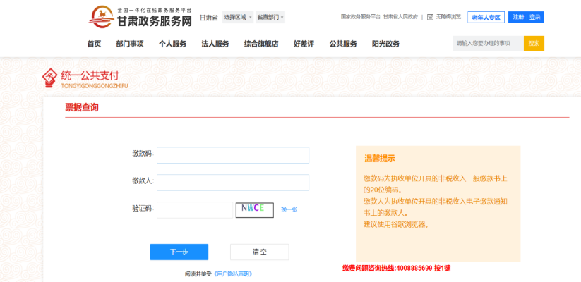 4.进入甘肃政务服务网-统一支付平台-查询/票据打印,输入缴款码(注:缴款码根据图5上的缴款码信息进行保留)、缴款人(注:缴款人为考试报名系统登录账号)进行电子票据的查询打印,如图11、图12、图13所示。