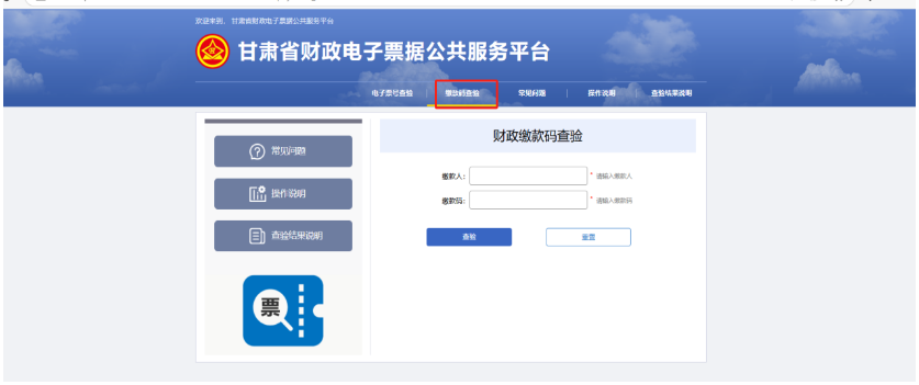 5.进入http://125.74.7.71:18002/billcheck甘肃省财政电子票据公共服务平台,缴款码查验功能进行票据查询,如图14所示。