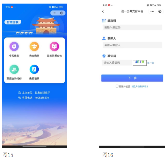 6.微信、支付宝小程序关注“甘肃非税”,在票据查询打印功能进行查询打印票据,如图15、图16所示。