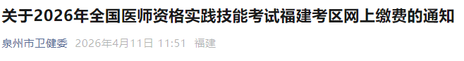 福建泉州2026年医师资格考试实践技能缴费已开始!考生速去!以下为福建泉州考点官方提醒,请相关考生仔细查看,按时完成技能缴费!