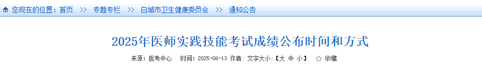 吉林白城2025年医师资格实践技能考试成绩出分时间已确定!以下为白城考点官方通知,请相关考生及时查看。