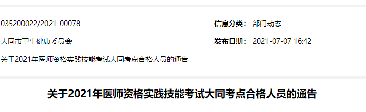 大同市卫健委发布了“2021年医师资格考试大同考点实践技能考试成绩查询的通知”,很多考生都在关注,医学教育网小编搜集整理如下: