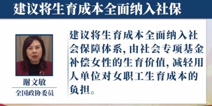 导语:全国政协委员谢文敏建议,将生育成本全面纳入社会保障体系,由社会专项基金补偿女性的生育价值,减轻用人单位对女职工生育成本的负担。