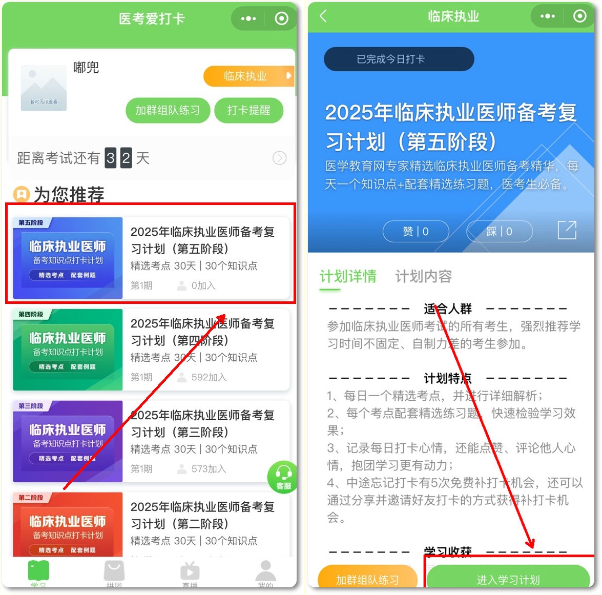 请选择“您的备考计划”,如临床执业医师备考复习计划(第五阶段),然后点击下方“加入计划开始学习”按钮,开始正式进入打卡学习;