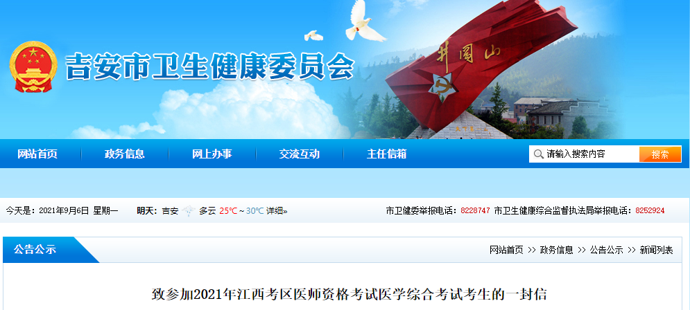 江西考区宜春考点的卫健委转发了致参加2021年江西考区医师资格考试医学综合考试考生的一封信,相信这是广大考生们关注的事情,医学教育网小编整理官方公告如下: