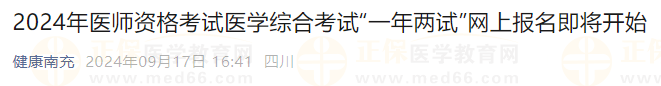 2024年医师资格考试医学综合考试“一年两试”网上报名通知已发布,“一年两试”网上报名时间2024年9月18日0时至9月24日24时,逾期不予补报。医学教育网小编为大家整理通知如下: