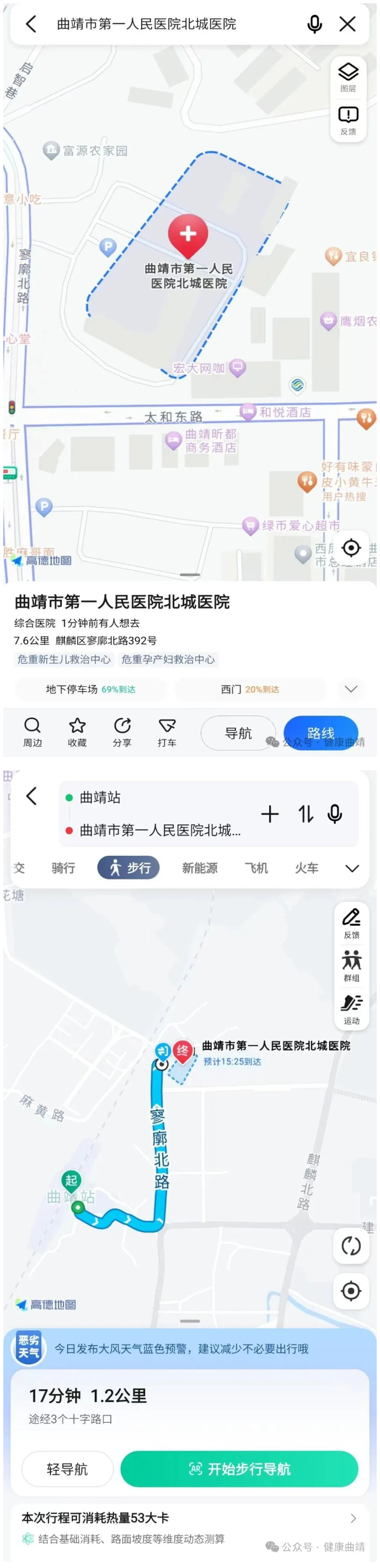 2.自驾或出租车路线:自驾车或打车需从曲靖市区→曲靖市第一人民医院北城医院到达。