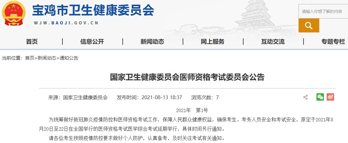 以上就是医学教育网关于“宝鸡市2021年国家医师综合考试全国延期!”的相关介绍,希望能够帮助到大家,更多资讯尽在医学教育网!