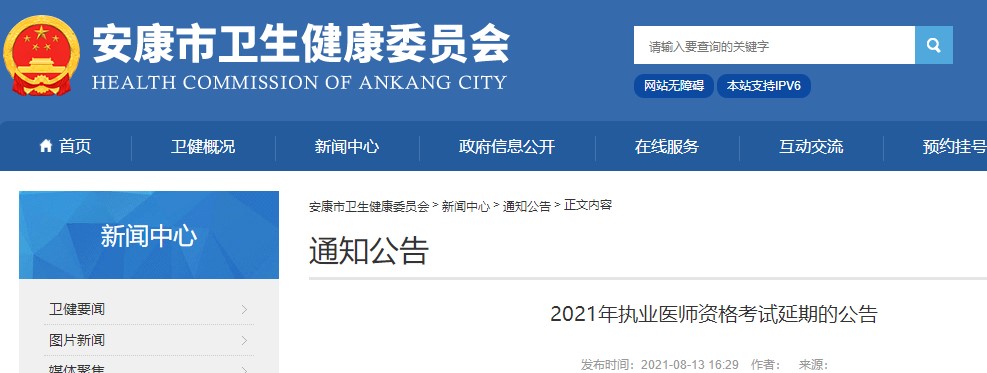 以上就是医学教育网关于“安康市2021年执业医师资格考试延期的公告”的相关介绍,希望能够帮助到大家,更多资讯尽在医学教育网!