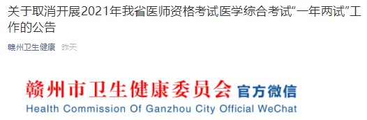 赣州考点2021年医师资格考试一年两试机会取消!官宣!关于取消开展2021年江西考区医师资格考试医学综合考试“一年两试”工作的公告内容如下: