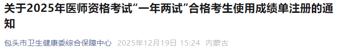 考生注意:内蒙古包头2025年医师资格“一年两试”注册开始!内蒙古2025年医师资格“一年两试”考生可以使用成绩单进行注册!请相关考生及时查看,尽早完成注册。