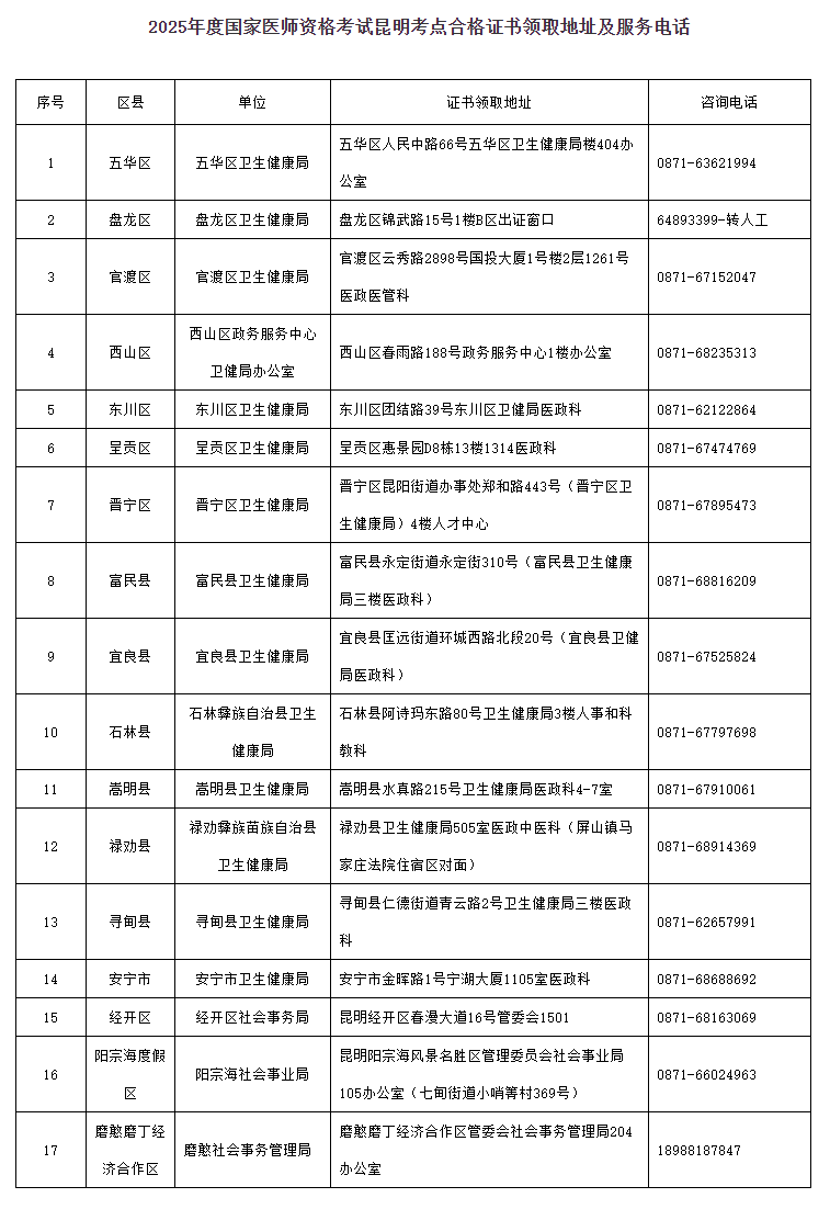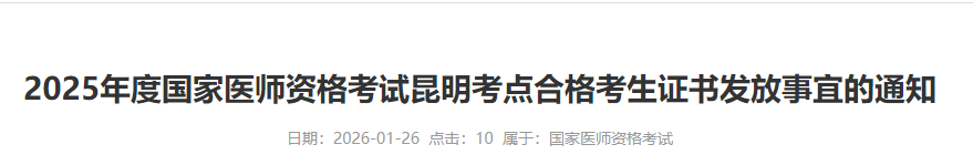 属于昆明市辖区内各县(市)区卫健局报名点申报,并参加医学综合笔试成绩合格的考生,可于2026年1月26日后联系各自所属县(市)区卫生健康局报名点领取资格证书。