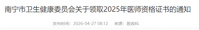 参加2025年医师资格考试且成绩合格的南宁市考点考生,自2026年4月28日起可领取医师资格证书。请相关单位及个人按要求前来办理领取手续,现将领取证书有关事项通知如下: