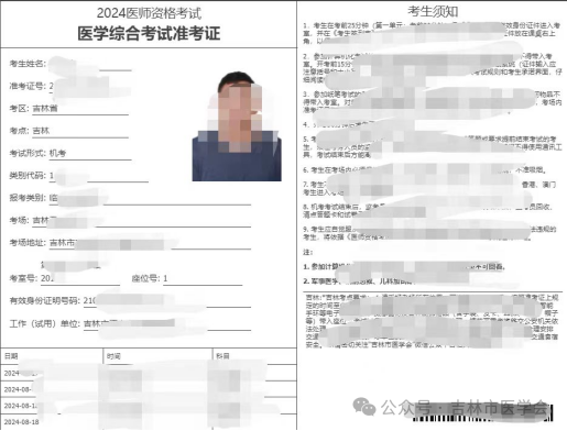吉林考点2024年医师资格考试医学综合考试准考证已经开通打印。特别提醒:需要打印的是准考证!不是报名成功单!