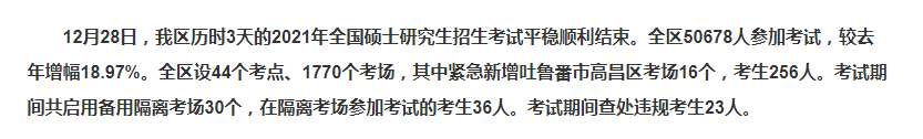 2021年硕士研究生招生考试已经于2020年12月28日顺利结束,新疆招生网发布了“新疆2021年全国硕士研究生招生考试工作平稳顺利结束”,其中涉及了新疆维吾尔自治区2021年考研的报考人数,为了帮助各位21与22考研的考生了解,医学教育网小编整理新闻内容如下!