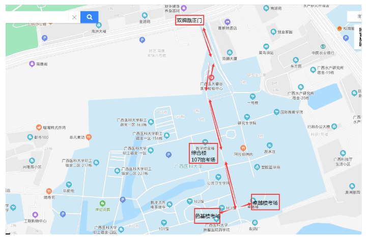 (一)根据疫情防控管理要求,我校现实行封闭式管理,考试期间禁止考生的任何车辆进入校园,所有考生必须步行沿考生专用通道,凭准考证及广西健康绿码进入我校考点参加考试,具体详见考场路线图: