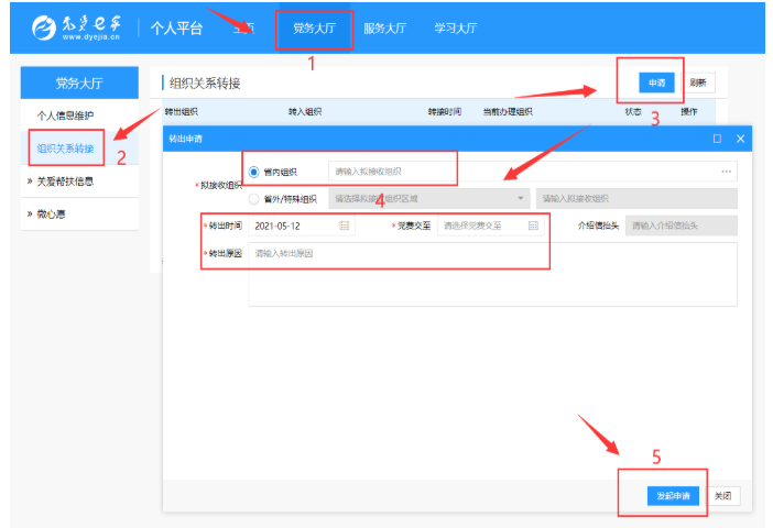 党员登录“党员e家”平台(www.dyejia.cn)→点击“登录”→登录个人平台→进入“党务大厅”→选择“组织关系接转”→点击“申请”→选择“省内组织”→填写拟接收党支部名称(中共厦门大学医学院2021级研究生支部委员会)→填写其他转出信息→点击“发起申请”,等待党组织逐级审批。如下图所示。
