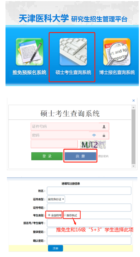 首次登陆查询系统考生需要先进行注册:点击硕士考生查询系统-点击注册-填入基本信息(其中考生类别统招生选择全国统考,推免生和16级“5+3”一体化学生选择推荐免试选项)-注册后登录