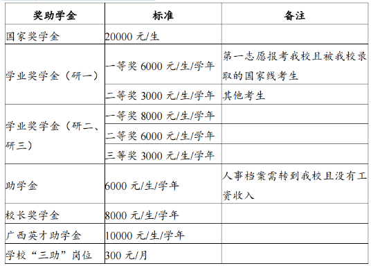 (二)奖助学金:我校将按照国家最新规定,设立国家奖学金、国家助 学金、学业奖学金、校长奖学金、广西英才助学金、三助岗位,建立多元奖 助体系,支持硕士生完成学业。