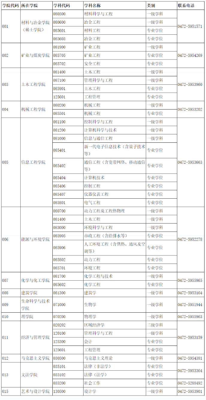 内蒙古科技大学硕士学位授权学科、专业一览及学院联系方式