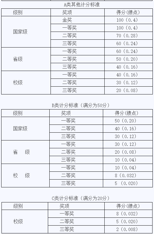 4.“互联网+”大学生创新创业大赛金奖、“挑战杯”大学生竞赛一等奖及以上和金奖、全国大学生数学建模竞赛和全国大学生电子设计竞赛国家级一等奖及以上的主力成员(排名前五),学术活动得分按满分计算。其他获奖等级的项目,排名第一的成员先提20%分值,然后所有成员(含署名第一的成员)再平均分配剩余分值。