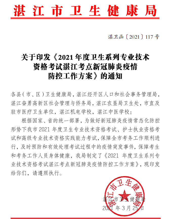 广东湛江赤坎区2021年全科主治医师考试新冠肺炎疫情防控通知