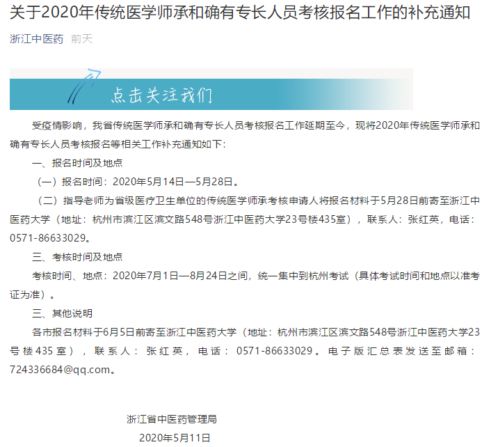 浙江省关于做好2020年传统医学师承和确有专长人员考核报名的补充通知