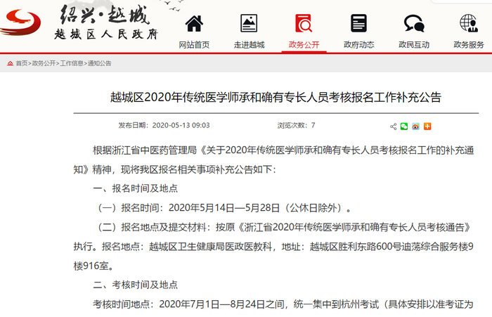 绍兴市越城区2020传统医学师承和确有专长人员考核报名的补充通知