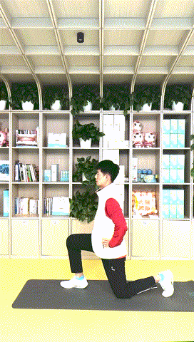 先以左膝跪地,右膝盖弯曲90度,大腿与地面平行,小腿与地面垂直。双手放在胯部。然后弯曲右膝盖,身体前倾,可以感受到右脚踝的拉伸。坚持20-30秒
