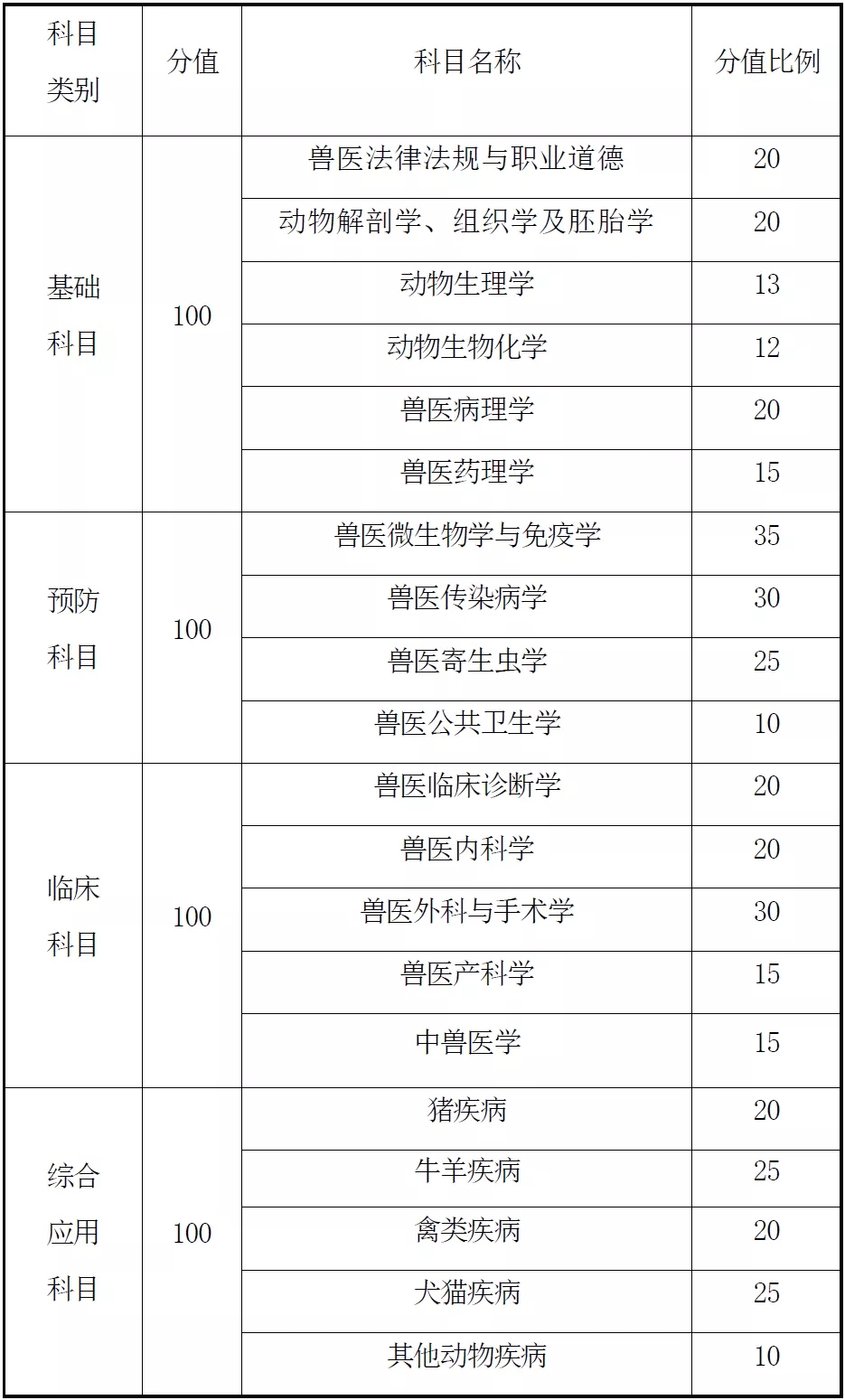 全国执业兽医资格考试(兽医全科类)考试主要考察执业兽医应该掌握的基本理论、基本技术和基本操作能力。基础科目主要考察应试者必须掌握的与临床实践相关的基本理论知识;预防科目主要考察常发和多发的动物疫病与人畜共患病的知识与技能;临床科目主要考察临床常见和多发普通病的诊断和治疗技能;综合应用科目主要考察应试者对一些常发重大疾病的处置、防控与治疗的综合能力。全国执业兽医资格考试(兽医全科类)每个科目100道题,每科100分,总分400分。考试范围请参考全国执业兽医资格考试委员会审定颁布的《全国执业兽医资格考试大纲(兽医全科类)(2020版)》。