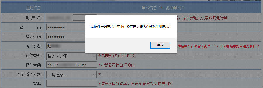 如果姓名有误,重新注册时,系统会提示“该证件号码在注册库中已经存在”,点击“确定”继续操作即可,如下图: