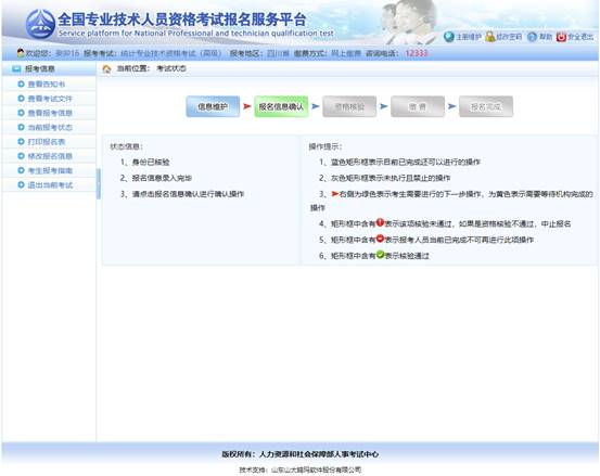 界面左侧显示状态信息,右侧显示操作提示,请报考人员参考上述信息进行相关操作,直到报名完成。